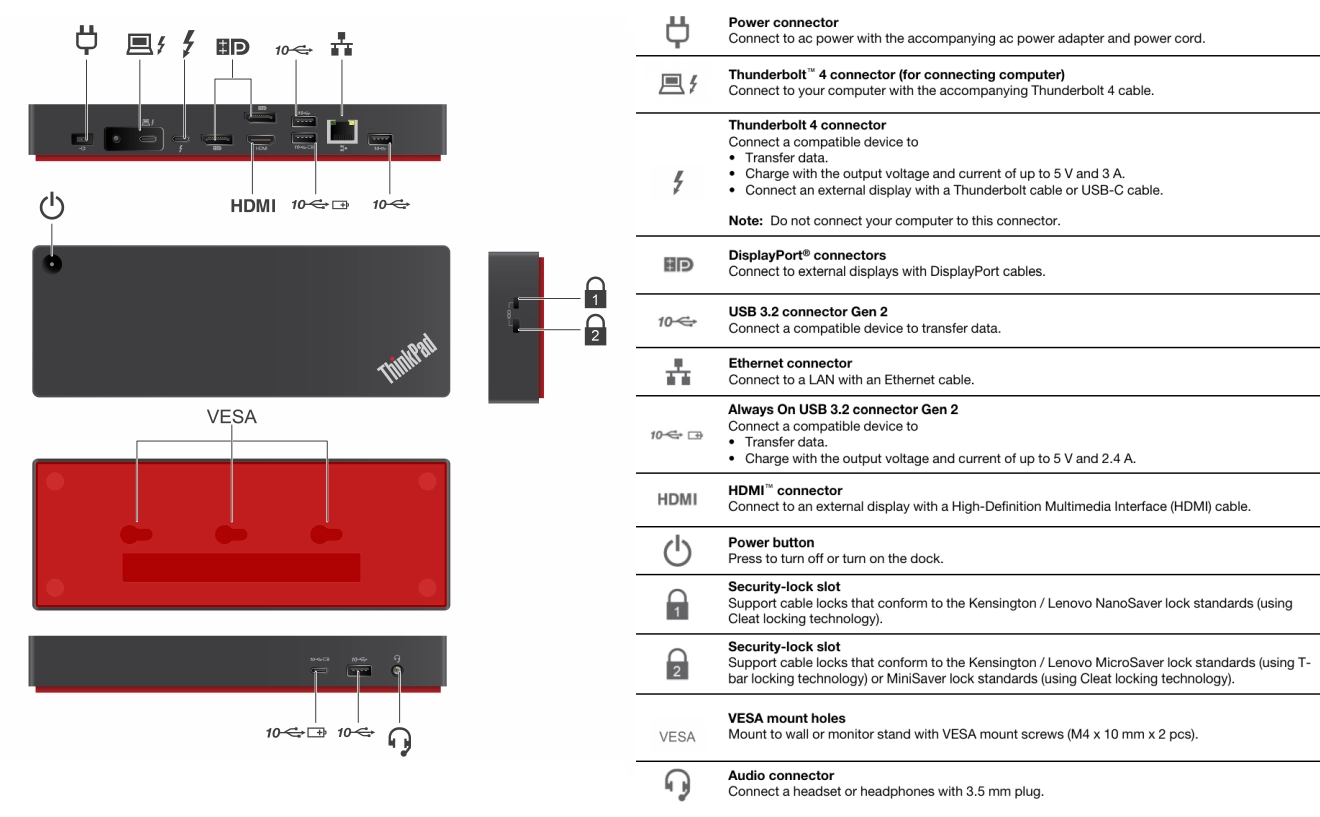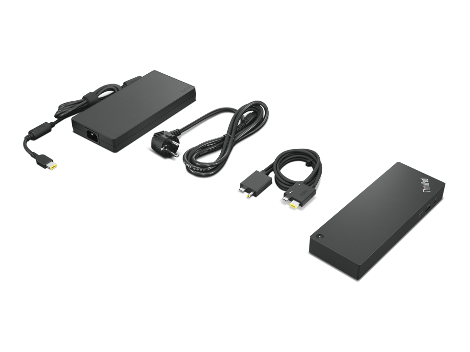 The ThinkPad Thunderbolt™ 4 Workstation Dock supports up to 230W PD, Single 8K@30Hz or upto 4 4K@60HZ display support, silent firmware upgrades, vPro/AMT Pass through support, and data transfer rates upto 40Gbps (depending on host system and peripheral processing capability, file attributes, and other configuration and operating environment factors).